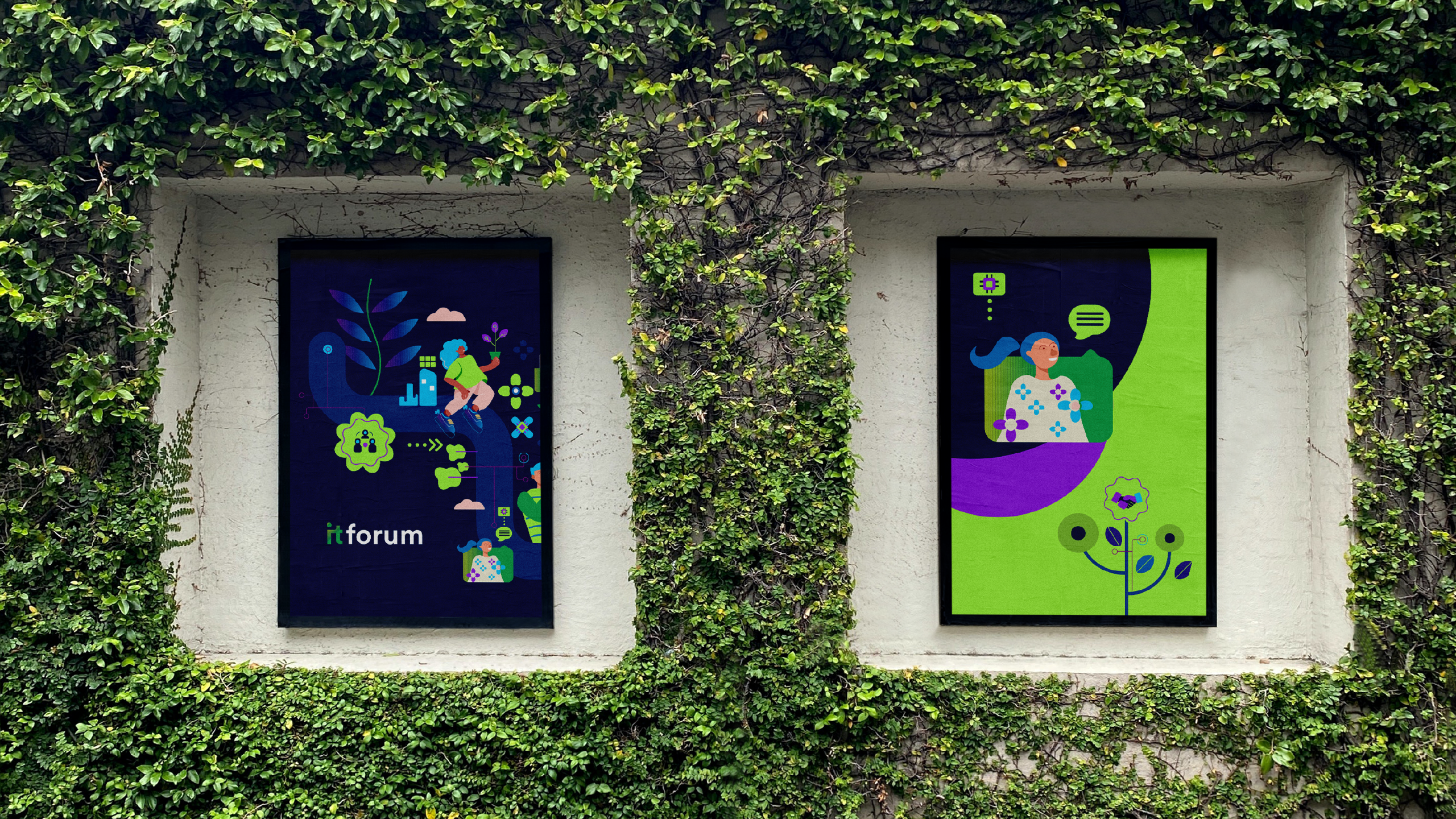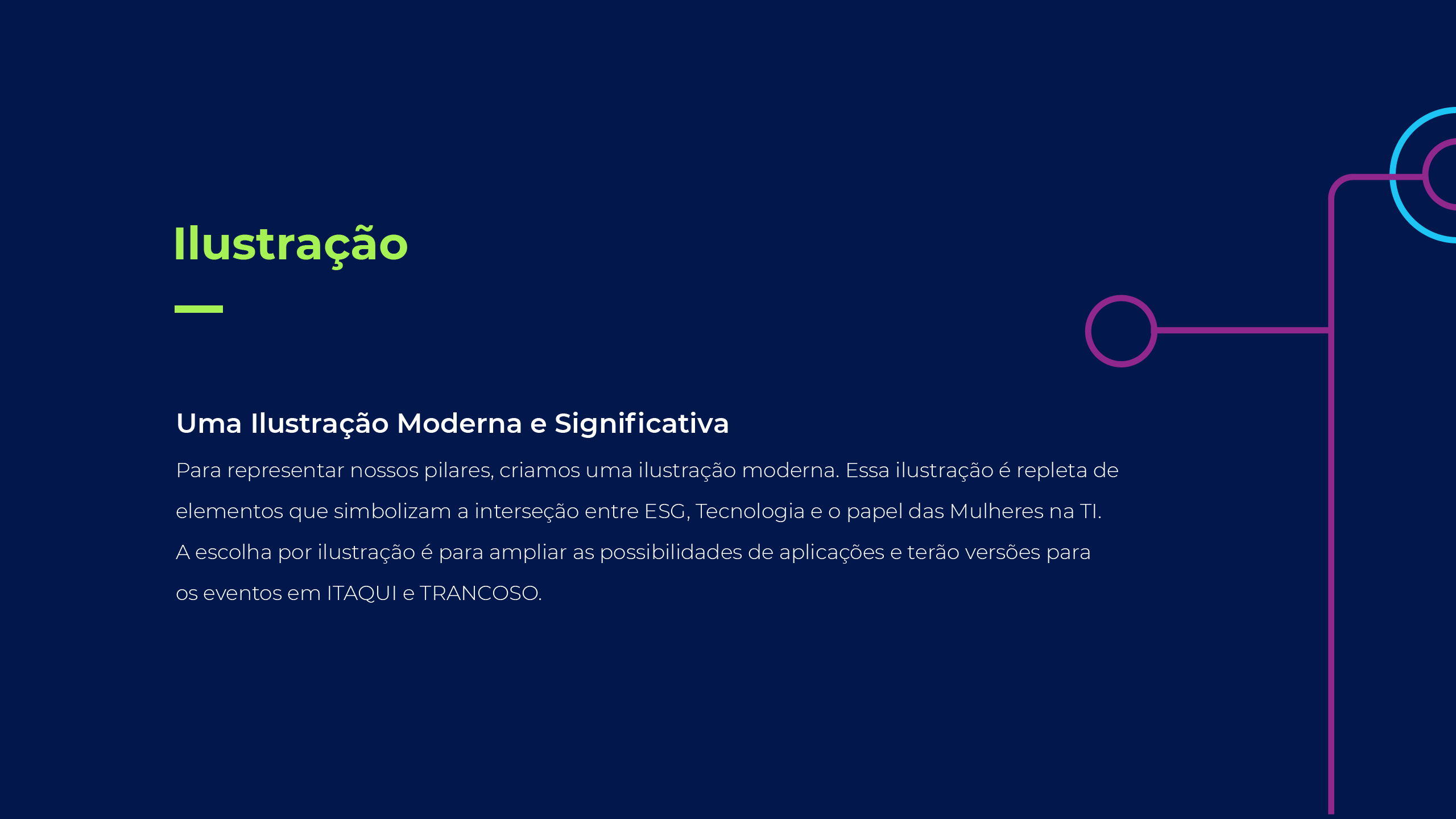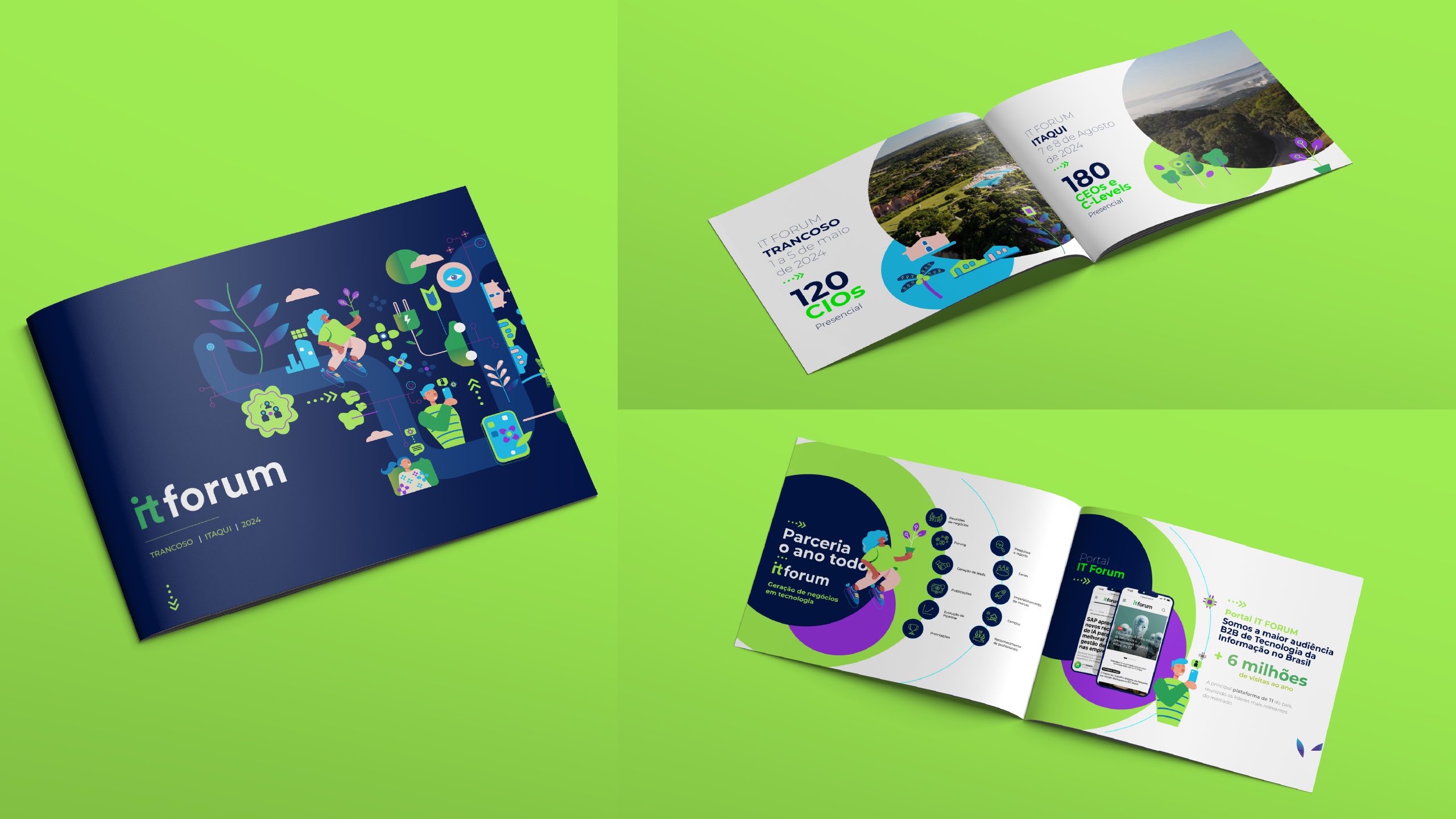 A identidade foi desenvolvida a partir de ilustrações contemporâneas que traduzem os pilares de ESG, inovação tecnológica e o protagonismo da mulher na TI. O projeto também contou com versões especiais para as edições de Itaqui e Trancoso, adaptando o conceito visual aos diferentes contextos do evento sem perder unidade e força de marca.