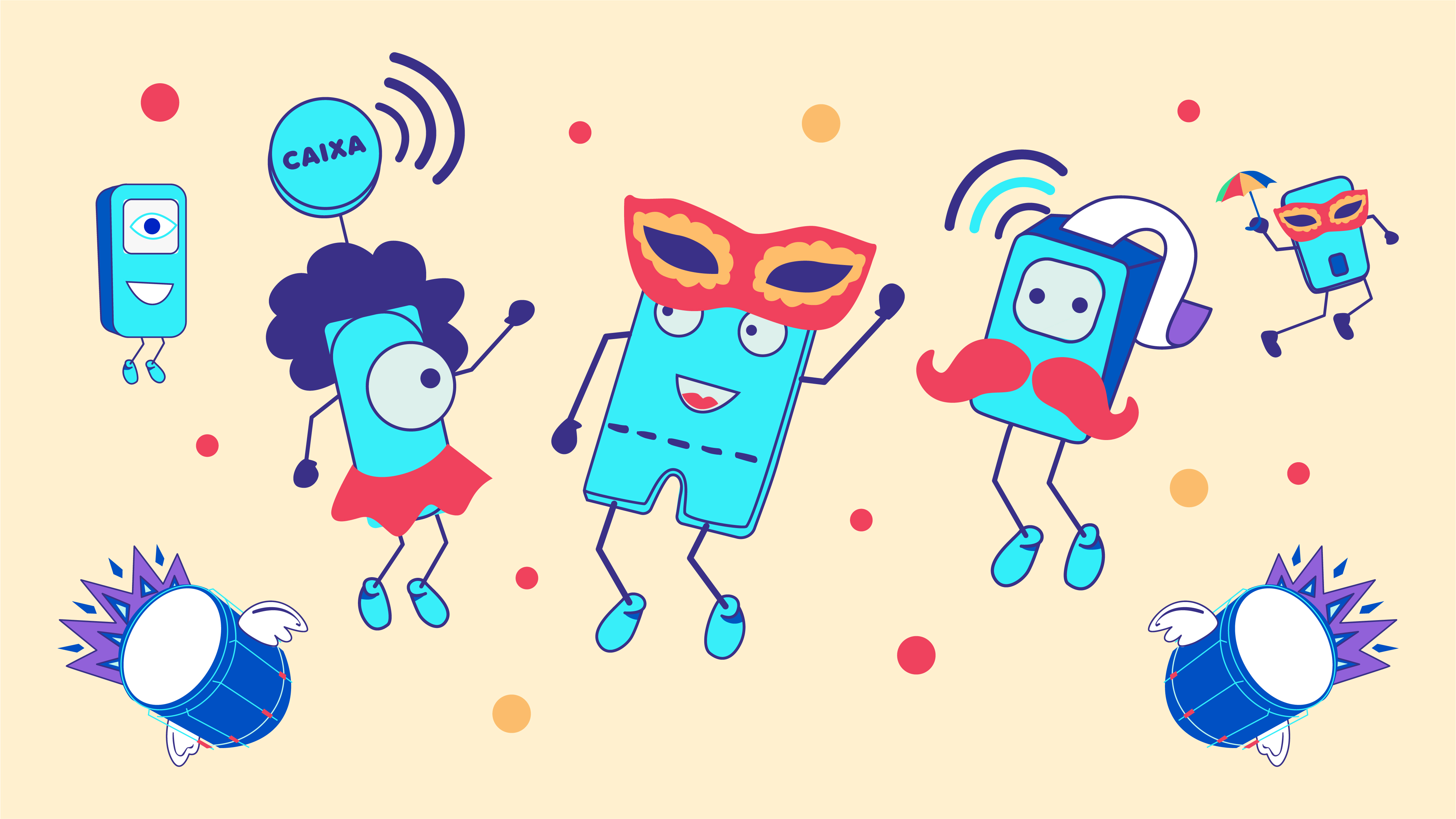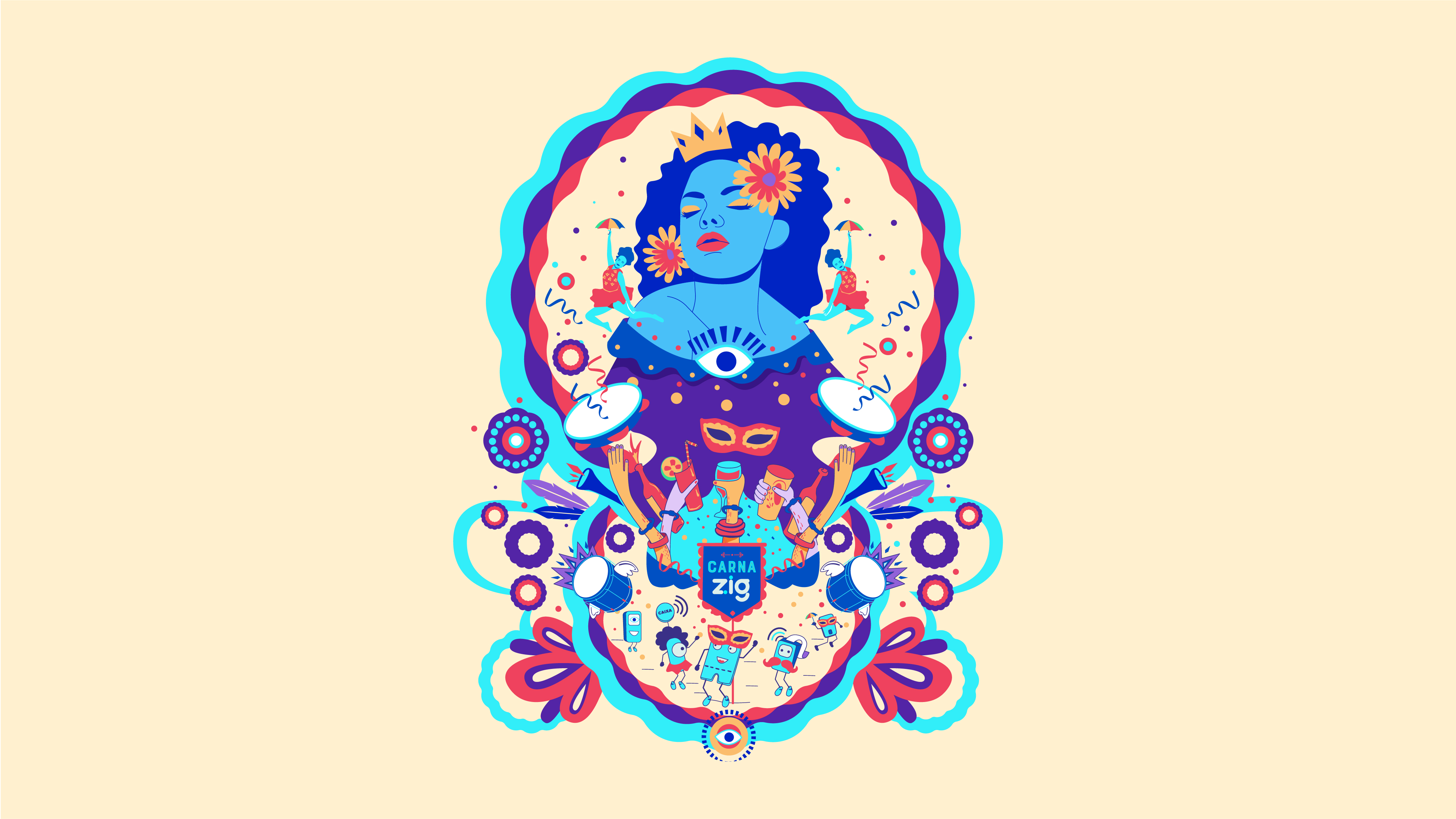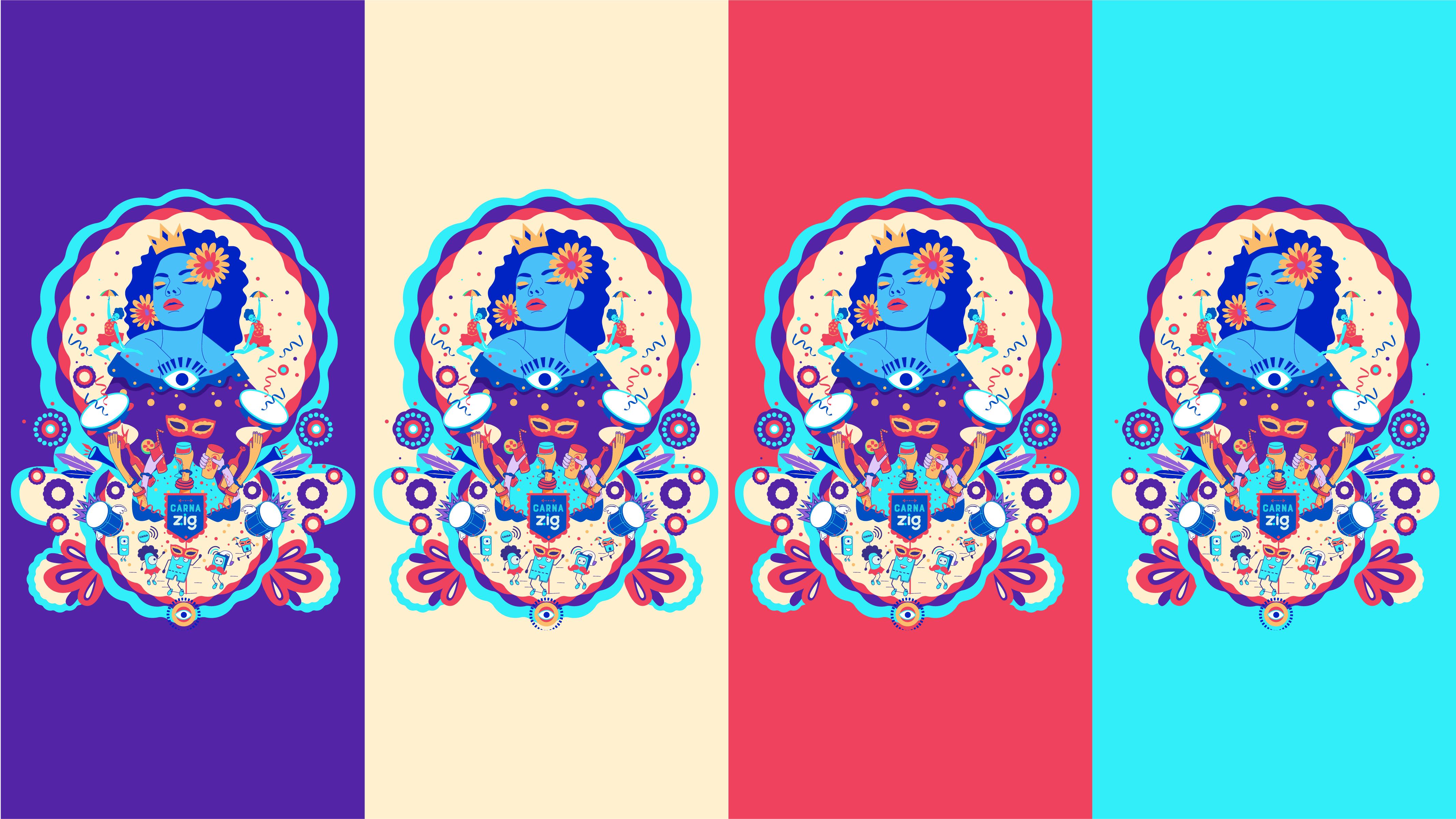 Criamos a identidade visual de Carnaval da ZIG, unindo tecnologia, produtos e festa. Ilustramos os produtos como personagens para traduzir as soluções da marca de forma simples, divertida e visualmente forte, conectando inovação ao clima do Carnaval.